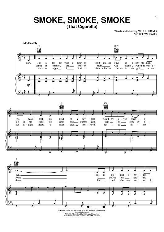 Digital Sheet Music for Smoke, Smoke, Smoke (That Cigarette) by Merle Travis, Sammy Davis Jr., Tex Williams scored for Piano/Vocal/Chords; id:394651