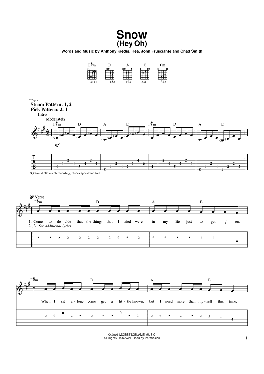 Digital Sheet Music for Snow (Hey Oh) by Flea, John Frusciante, Anthony Kiedis, Red Hot Chili Peppers, Chad Smith scored for Easy Guitar Tab; id:401512