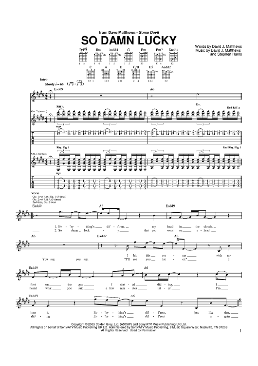 Digital Sheet Music for So Damn Lucky by Dave Matthews, Stephen Harris scored for Guitar Tab; id:373799