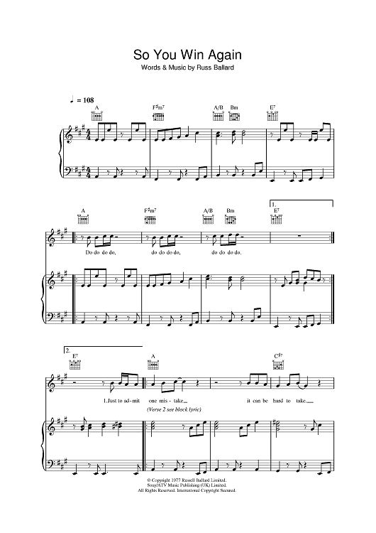 Digital Sheet Music for So You Win Again by Russ Ballard, Hot Chocolate scored for Piano/Vocal/Chords; id:392877