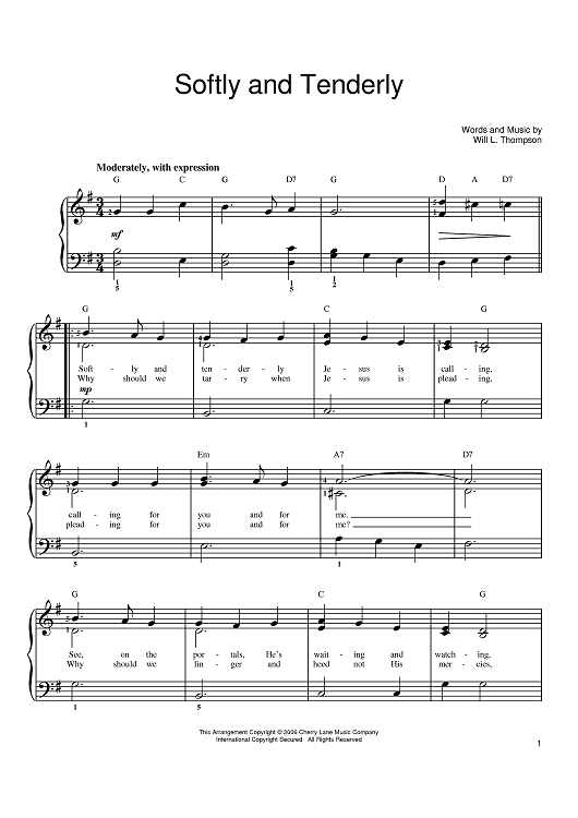 Digital Sheet Music for Softly And Tenderly by Will L. Thompson scored for Easy Piano; id:390160
