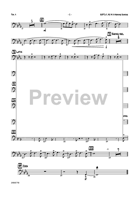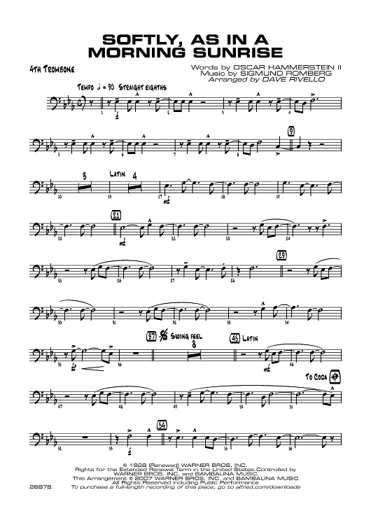 Digital Sheet Music for Softly, As in a Morning Sunrise - Trombone 4 by Sigmund Romberg, Oscar Hammerstein II, Dave Rivello scored for Jazz Ensemble; id:360376