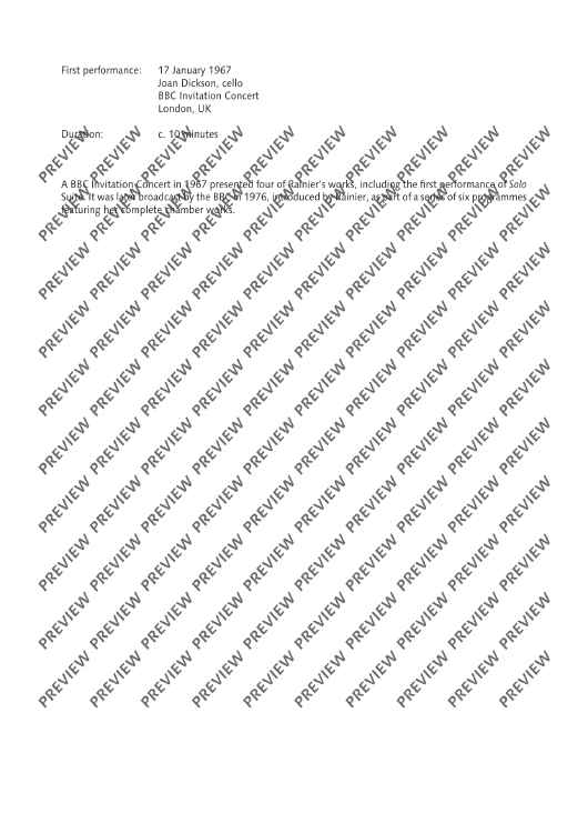 A BBC Invitation Concert in 1967 presented four of Rainier’s works, including the first performance of Solo Suite. It was later broadcast by the BBC in 1976, introduced by Rainier, as part of a series of six programmes featuring her complete chamber works.