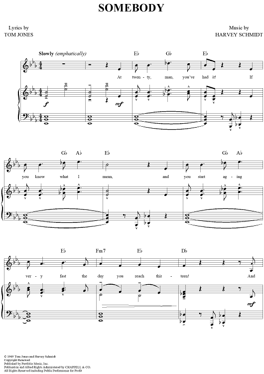 Digital Sheet Music for Somebody by Tom Jones, Harvey Schmidt scored for Piano/Vocal/Chords; id:304250