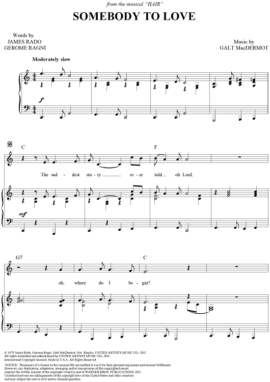 Digital Sheet Music for Somebody to Love by Galt MacDermot, James Rado, Gerome Ragni scored for Piano/Vocal/Chords; id:251849