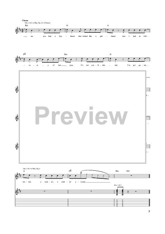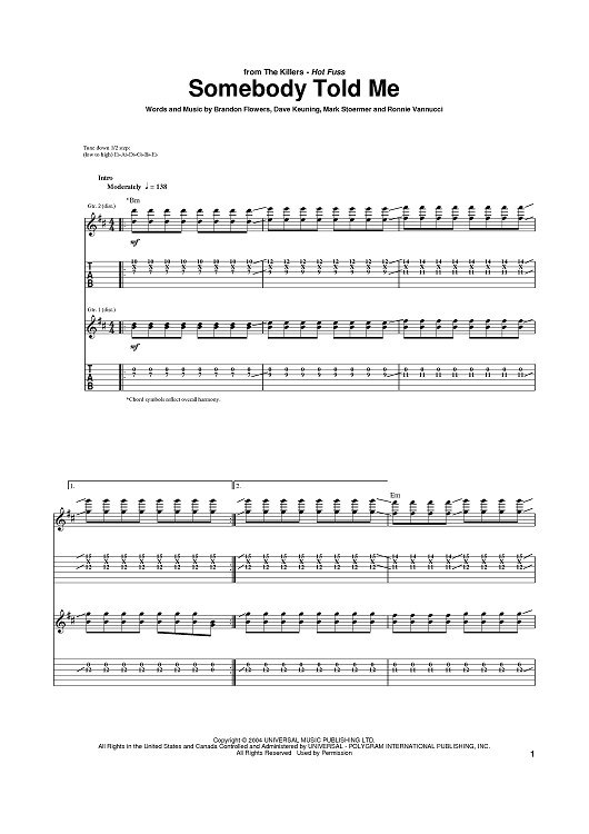 Digital Sheet Music for Somebody Told Me by Brandon Flowers, Dave Keuning, The Killers, Mark Stoermer, Ronnie Vannucci Jr. scored for Guitar Tab; id:380366