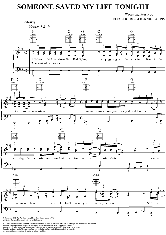 Digital Sheet Music for Someone Saved My Life Tonight by Elton John, Bernie Taupin scored for Easy Piano/Vocal; id:285551