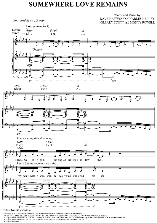 Digital Sheet Music for Somewhere Love Remains by Monty Powell, Hillary Scott, Lady Antebellum, Charles Kelley, Dave Haywood scored for Piano/Vocal/Chords; id:452042