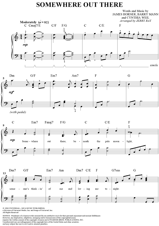 Digital Sheet Music for Somewhere Out There by Jerry Ray, James Horner scored for Easy Piano/Vocal; id:197226