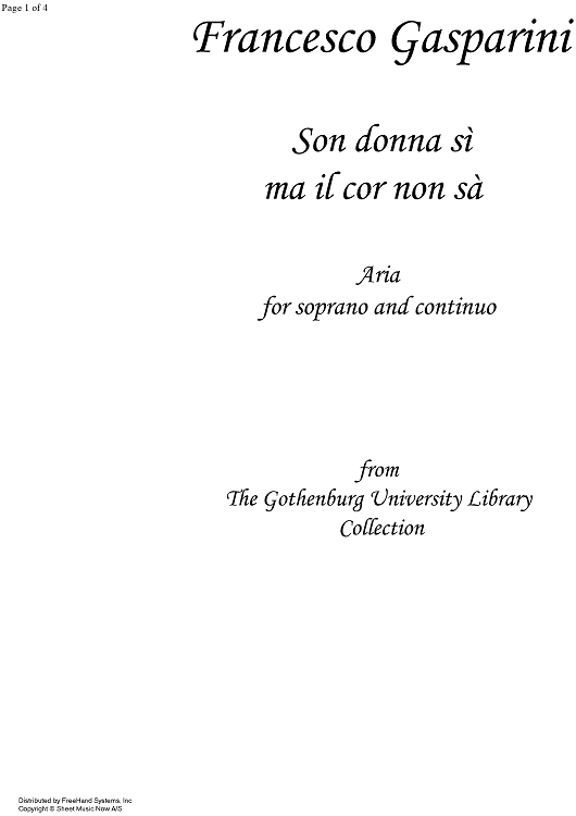Digital Sheet Music for Son donna sì ma il cor non sà by Francesco Gasparini, Eilif Zachariassen scored for Soprano/Continuo; id:323578
