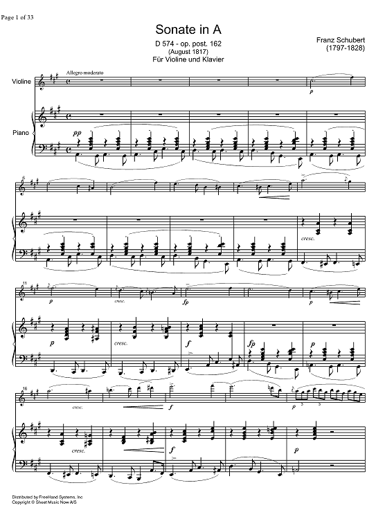 Digital Sheet Music for Sonata A Major D574 - Score by Franz Schubert scored for Violin/Piano; id:322560