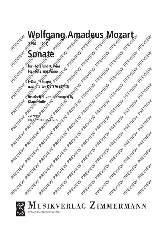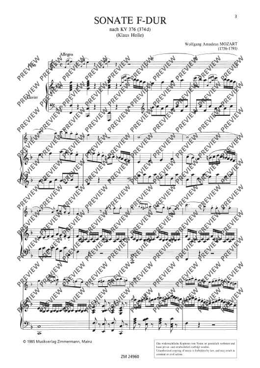 Digital Sheet Music for Sonata F major KV 376 (374d) in F major by Wolfgang Amadeus Mozart, Klaus Holle scored for Flute And Piano; id:501614