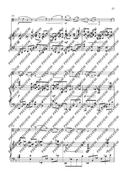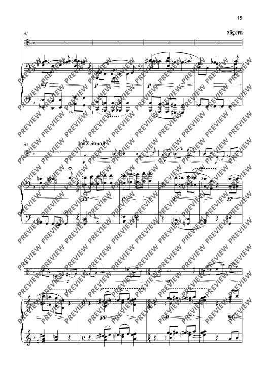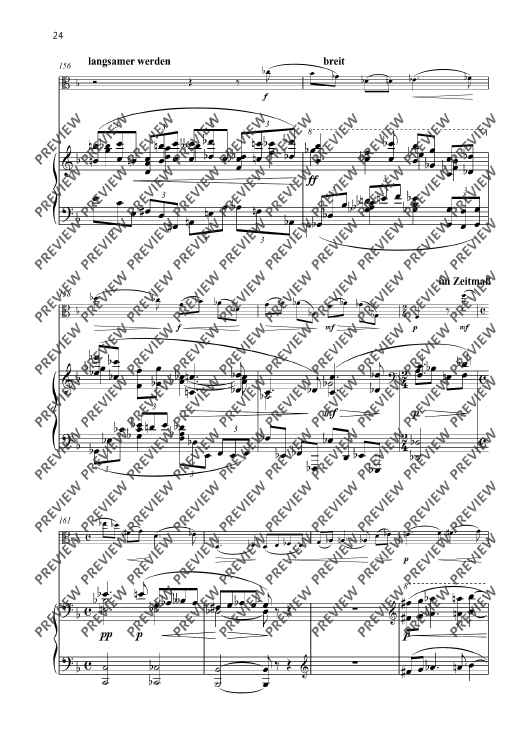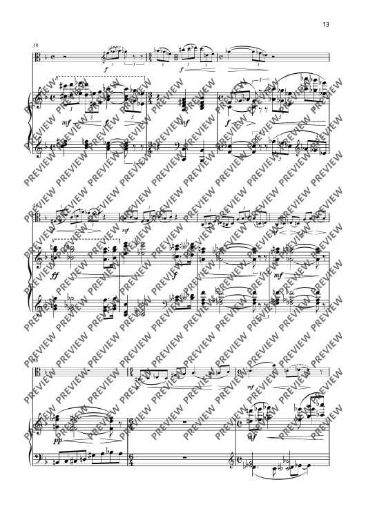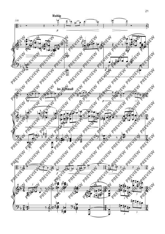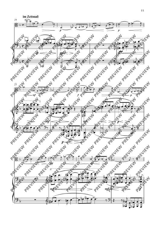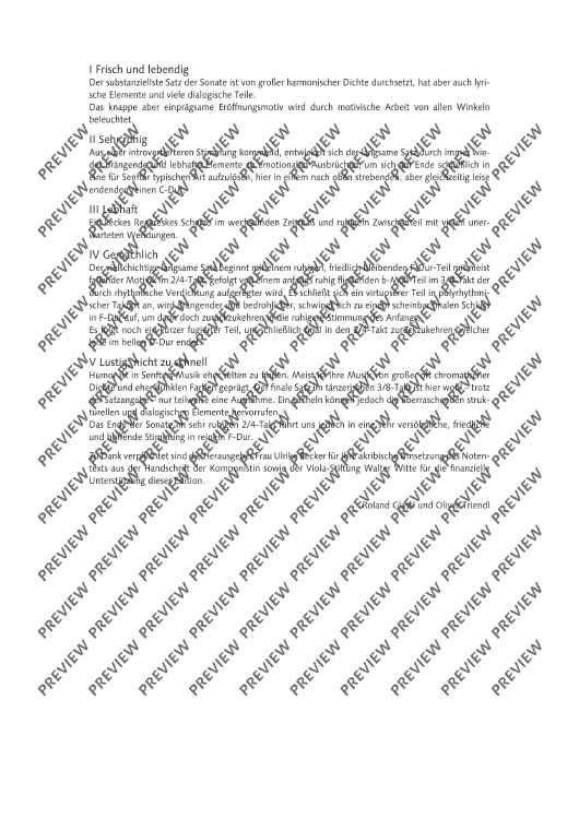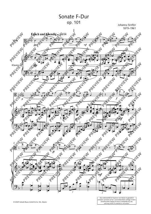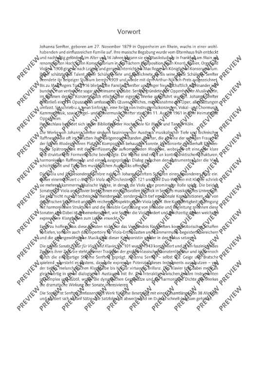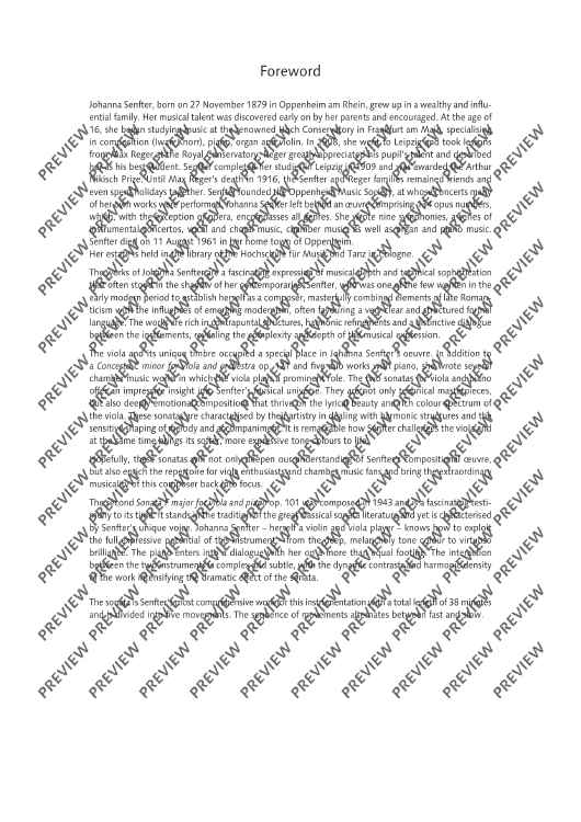The second Sonata F major for viola and piano op. 101 was composed in 1943 and is a fascinating testimony to its time. It stands in the tradition of the great classical sonata literature and yet is characterised by Senfter’s unique voice. Johanna Senfter – herself a violin and viola player – knows how to exploit the full expressive potential of this instrument – from the deep, melancholy tone colour to virtuoso brilliance. The piano enters into a dialogue with her on a more than equal footing. The interaction between the two instruments is complex and subtle, with the dynamic contrasts and harmonic density of the work intensifying the dramatic effect of the sonata. The sonata is Senfter’s most comprehensive work for this instrumentation with a total length of 38 minutes and is divided into five movements. The sequence of movements alternates between fast and slow. I Frisch und lebendig (Fresh and lively) The most substantial movement of the sonata is interspersed with great harmonic density, but also has lyrical elements and many dialogue sections. The brief but memorable opening motif is illuminated from all angles through motivic work. II Sehr ruhig (Very calm) Coming from a more introverted mood, the slow movement develops into emotional outbursts through constantly pressing and lively elements, only to finally dissolve at the end in a manner typical of Senfter, here in an upwardly striving but at the same time quietly ending pure C major. III Lebhaft (Vivid) A cheeky Reger-esque scherzo in alternating time signatures and a quiet intermediate section with many unexpected twists and turns. IV Gemächlich (Leisurely) The multi-layered slow movement begins with a calm, peaceful F major section with mostly falling motifs in 2/4 time, followed by an initially calmly flowing B flat minor section in 3/4 time, which becomes more agitated through rhythmic intensification. This is followed by a more virtuosic section in polyrhythmic time signature, which becomes more urgent