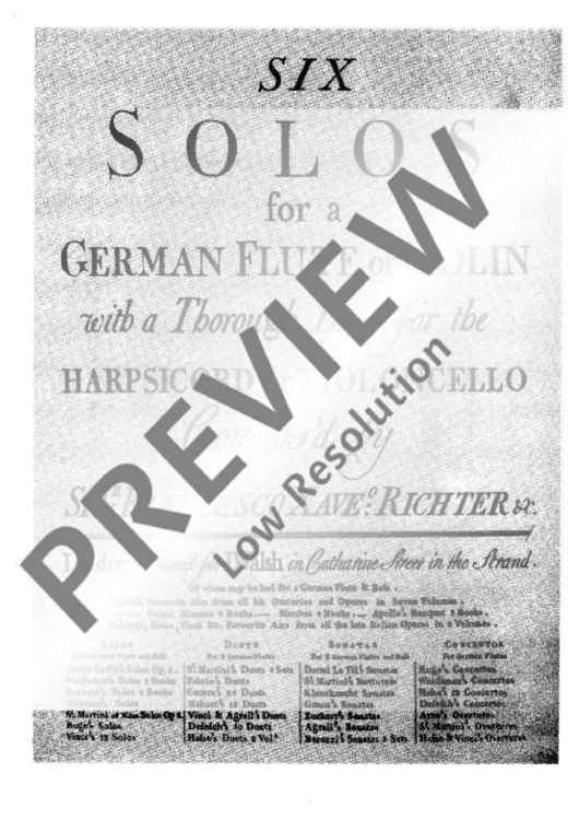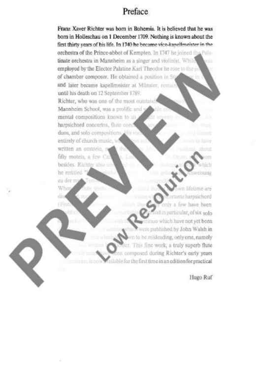 Wenn von den zu seinen Lebzeiten gedruckten Querflötenkompositionen Richters die Rede ist, so werden neben den erfreulicherweise nur zum geringen Teil neuveröffentlichten Sonaten mit konzertierendem Cembalo (Festival der Sequenzen) und einer Reihe beachtenswerter Duette immer wieder sechs Solosonaten für Flöte oder Violine mit Basso continuo erwähnt, nach denen man aber vergebens suchen wird. Von den bei John Walsh in London unter bewusst irreführendem Titel erschienenen sechs Sonaten stammt tatsächlich nur eine einzige, die erste nämlich, von Richter. Dieses schöne Werk, ein wahrhaft superbes Flötenstück, das in Richters früher Mannheimer Zeit entstanden sein muss, legen wir hier in einer Ausgabe für den praktischen Gebrauch vor.