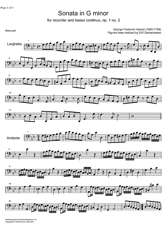 Digital Sheet Music for Sonata g minor Op. 1 No. 2 HWV 360 - Bass by George Frideric Handel, Eilif Zachariassen scored for Recorder/Continuo; id:324759
