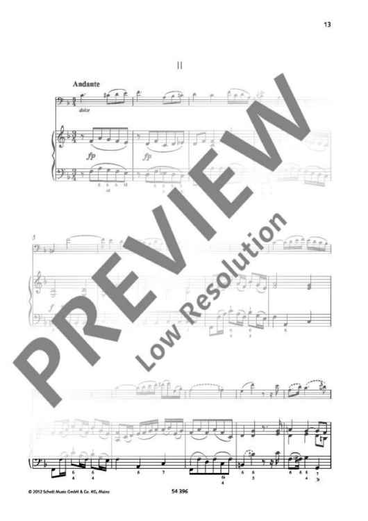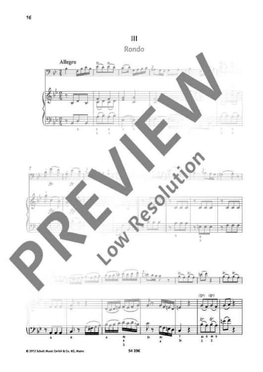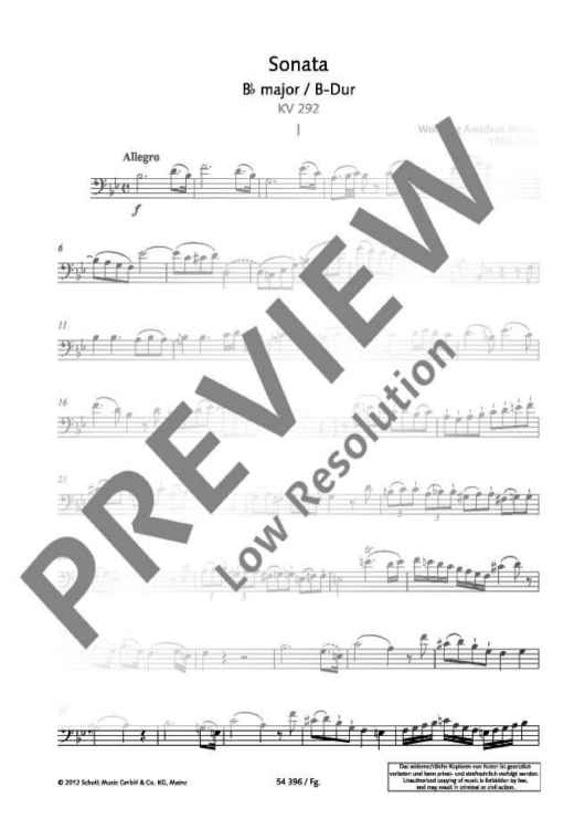 Wolfgang Amadeus Mozart wrote not only a concerto for the bassoon, but also a Sonata for bassoon and violoncello (in B flat major, KV 292) the origins of which are obscure. The original manuscript has been lost, and the only extant documents are prints published after his death. While the string instrument in this work is only given the function of accompanying instrument, the bassoon has the leading part. It is therefore natural to think less of a duo playing on equal terms but rather of a sonata with basso continuo accompaniment. This edition therefore transforms the violoncello part into a basso continuo part so that the work can now be played as a 'normal' bassoon sonata with piano accompaniment – a nice addition to the repertoire! The solo part can alternatively be played by a violoncello as well.