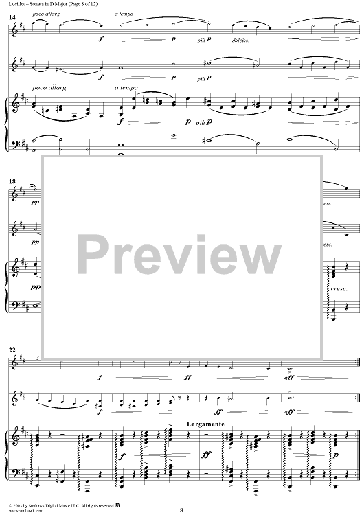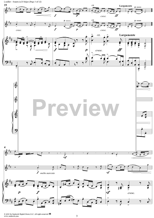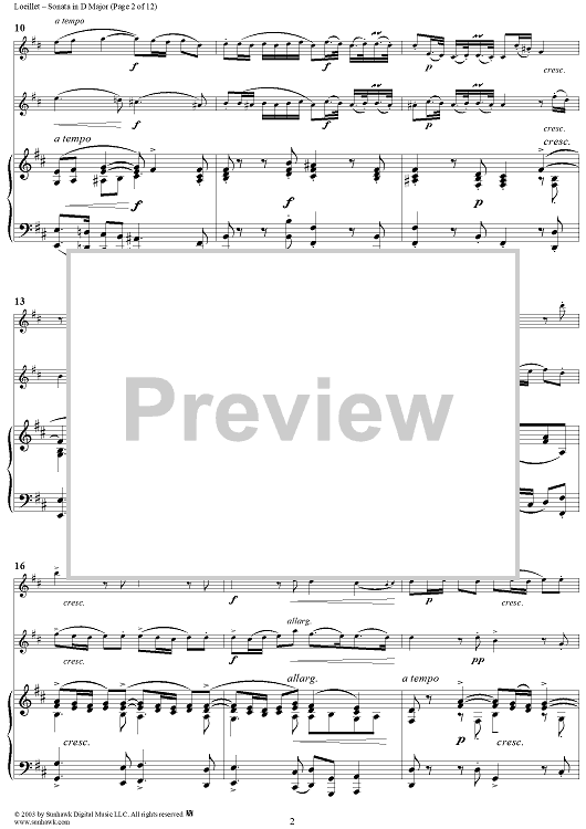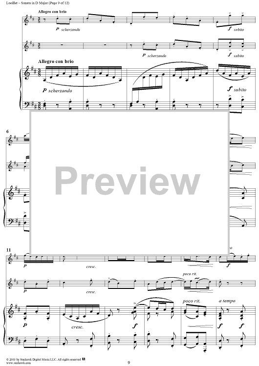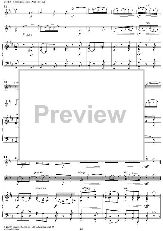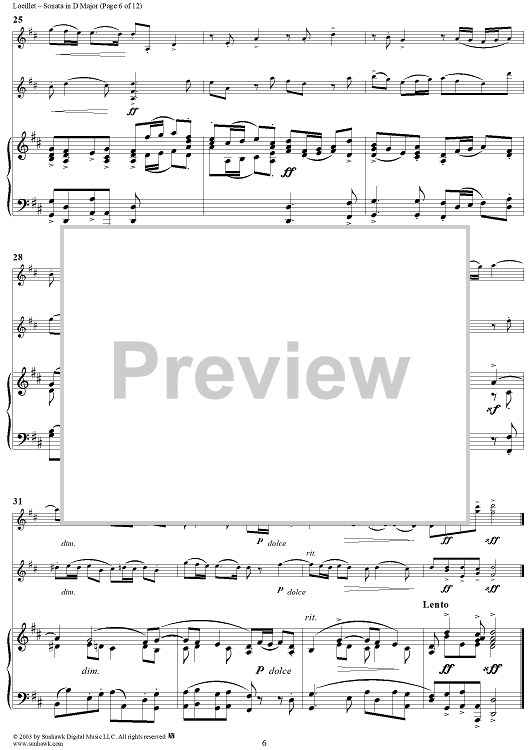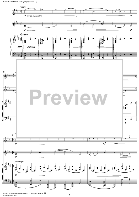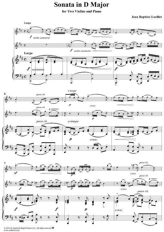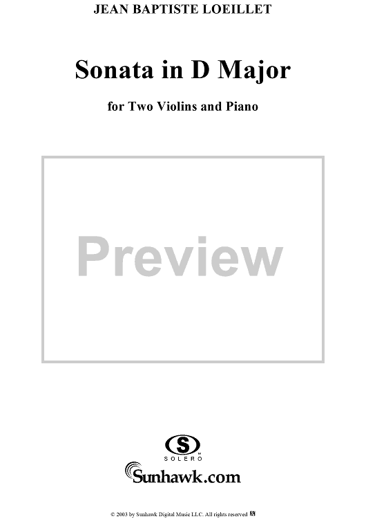 Digital Sheet Music for Sonata in D Major - Piano Score by Jean Baptiste Loeillet scored for Two Violins/Piano; id:295138
