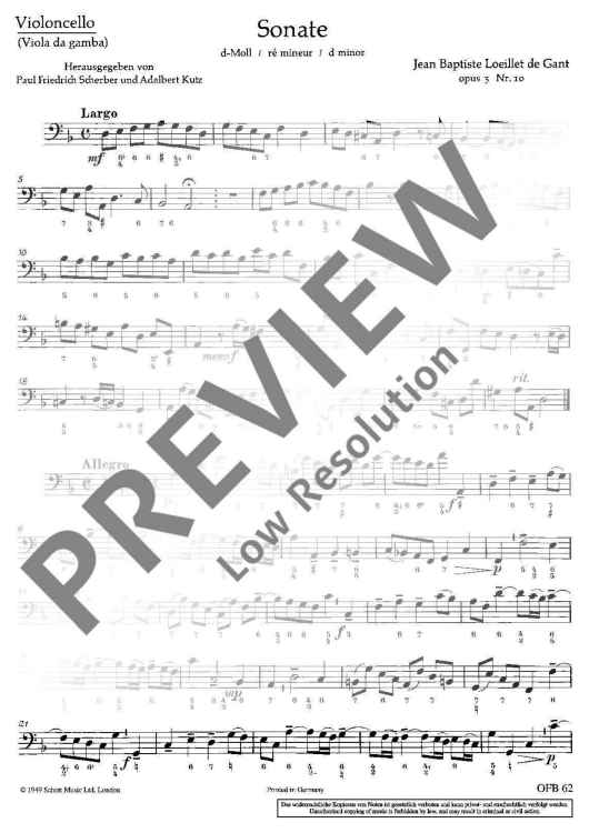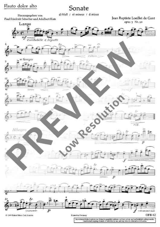 "Sonata in D minor" Sheet Music by Jean Baptiste Loeillet de Gant