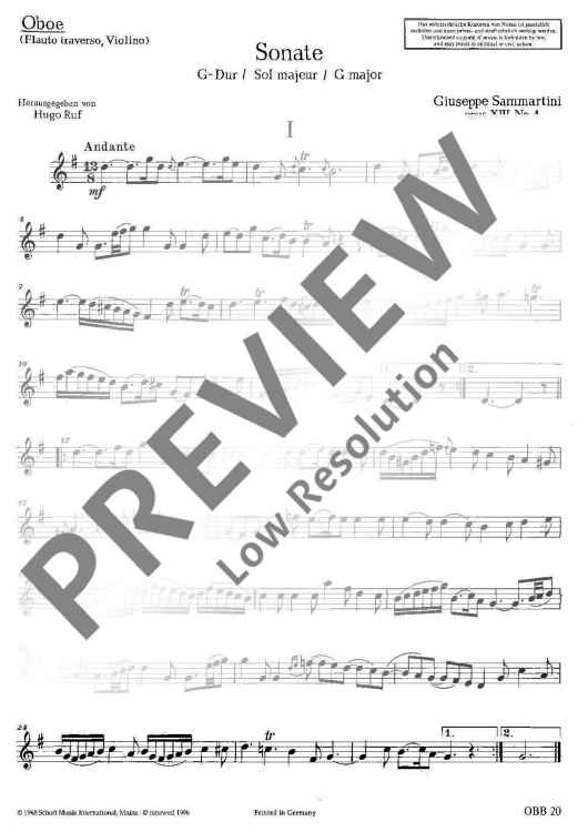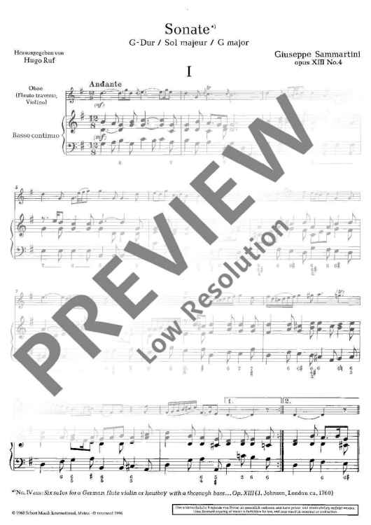 Digital Sheet Music for Sonata in G major by Giovanni Battista Sammartini scored for Oboe (flute, Violin) And Basso Continuo; id:476049