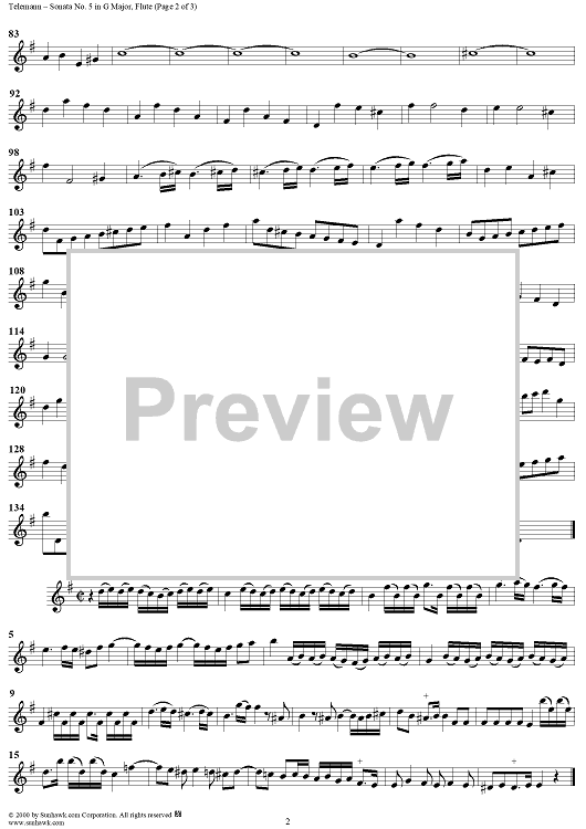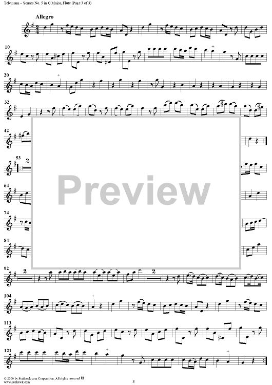 Digital Sheet Music for Sonata No. 5 in G Major - Flute by Georg Philipp Telemann scored for Flute/Violin/Viola/Cello; id:236682