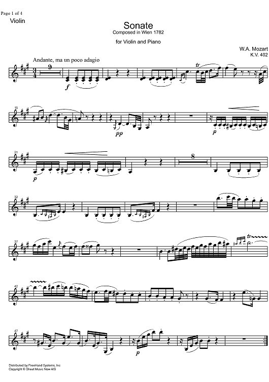 "Sonata No.29 A Major KV402 - Violin" Sheet Music by Wolfgang Amadeus Mozart