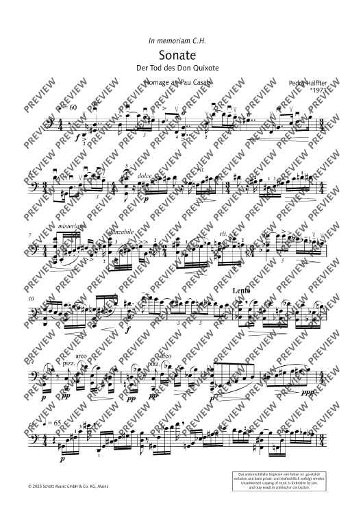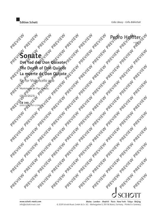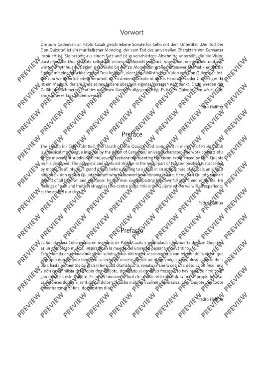 The work consists of a single movement subdivided into several sections representing the vision experienced by Don Quijote on his deathbed. The energetic and confused rhythm in the initial part of the composition is succeeded by moments of intensive grand drama before coming to a close in an atmosphere of despair, an almost nihilistic vision of Don Quijote himself who is doomed to continuing failure. Here, Quijote appears devoid of all heroism and greatness: he is a man contemplating his downfall at the end of his life. His feelings of pain and fruitless struggles take centre stage: this is the Quijote whom we will all experience at the end of our days. Pedro Halffter