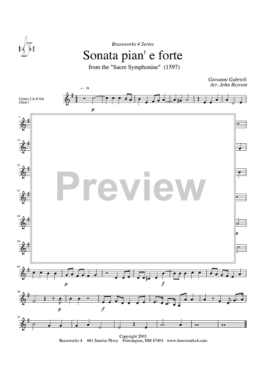Digital Sheet Music for Sonata pian' e forte - from the "Sacre Symphoniae" (1597) - Cornet 2 in Bb Choir I by Giovanni Gabrieli, John Beyrent scored for Brass Ensemble; id:429035