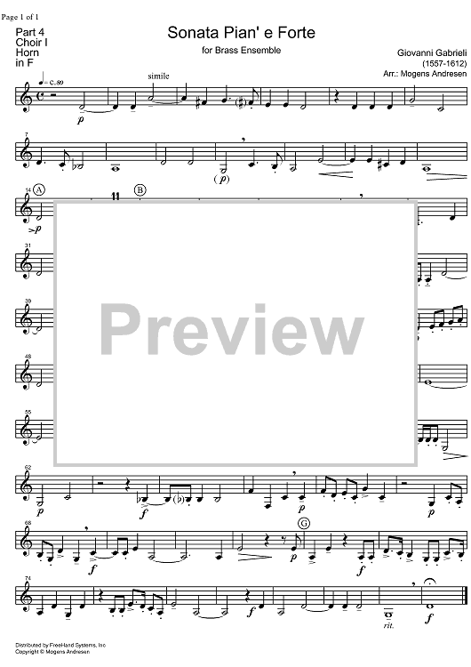 Digital Sheet Music for Sonata Pian' e Forte - Horn in F by Giovanni Gabrieli, Mogens Andresen scored for Brass Ensemble; id:326888