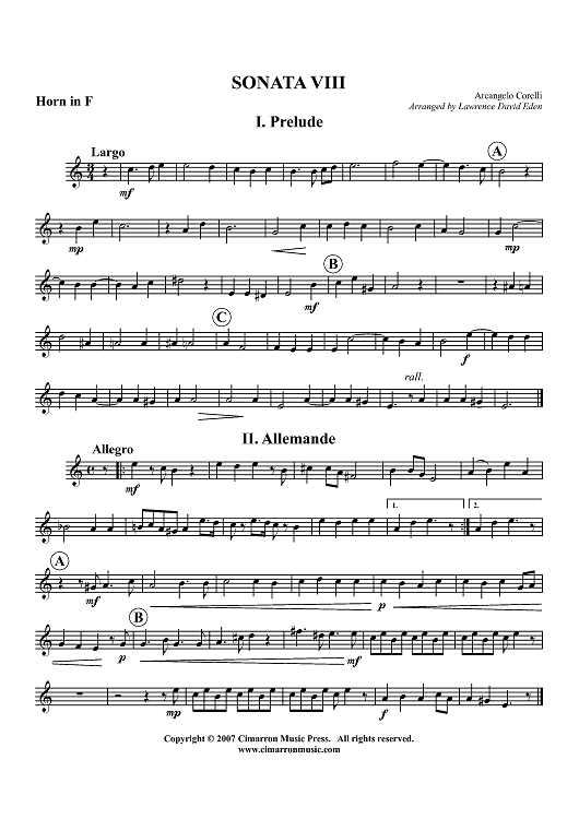 "Sonata VIII - Horn in F" Sheet Music by Arcangelo Corelli