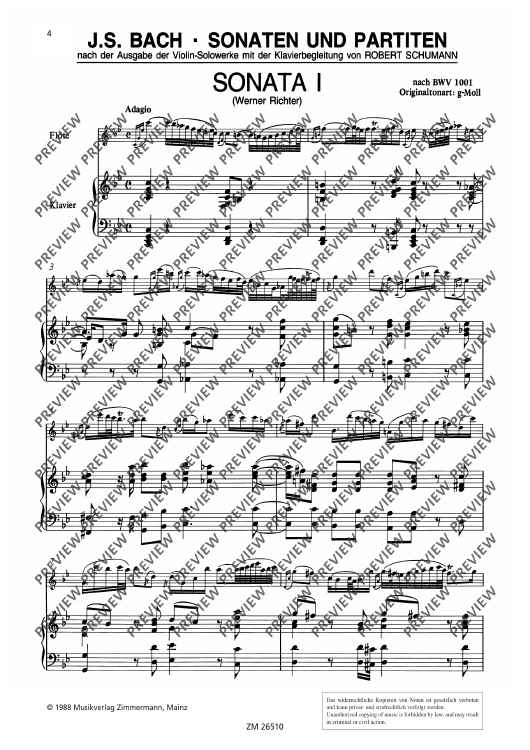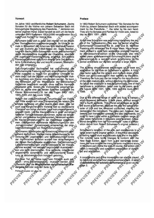 Richter hat Robert Schumanns 1853 erschienene Klavierbegleitungen dieser Adaption für die Flöte zugrunde gelegt. Kleine Abweichungen vom Urtext in Schumanns Wiedergabe der Solostimme wurden stillschweigend der Neuen Bach-Ausgabe angeglichen und die zahlreichen Lautstärkeanweisungen und Bindebögen in der Klavierstimme - mit wenigen begründeten Ausnahmen - nicht übernommen.