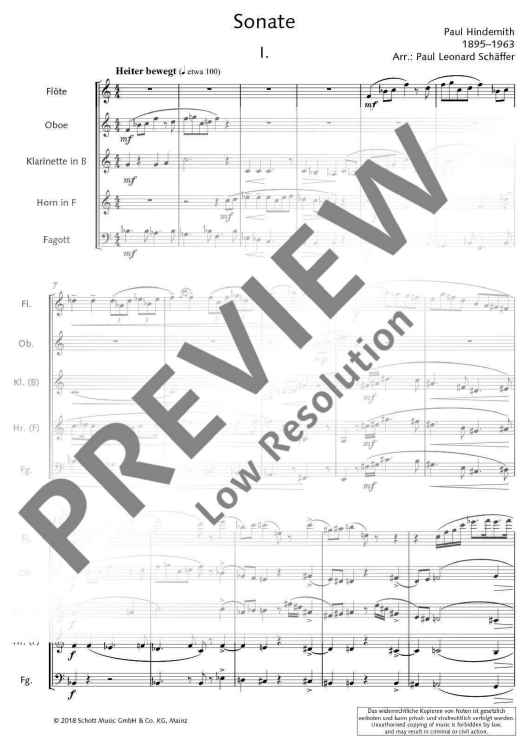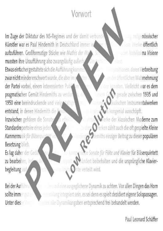 Paul Hindemiths Sonaten gehören in das Repertoire vieler Instrumentalisten. Da Hindemith mit der Kleinen Kammermusik für Bläserquintett nur ein einziges Werk für diese Besetzung schrieb, lag nahe, eine seiner Sonaten dafür zu bearbeiten. Paul Leonard Schäffer behält in seiner Bearbeitung der Sonate für Flöte den Solopart bei und verteilt die Klavierbegleitung auf die verbleibenden Instrumente.