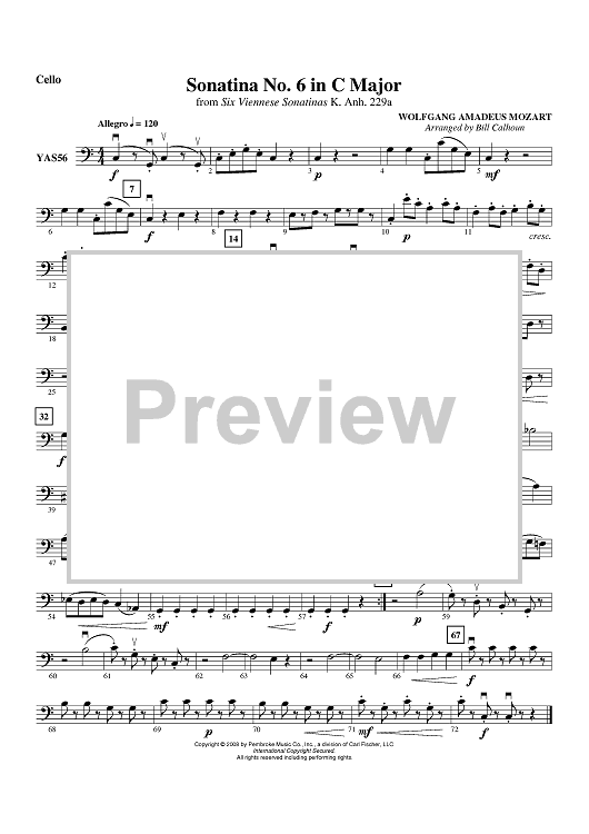 Digital Sheet Music for Sonatina No.6 In C Major - Cello by Wolfgang Amadeus Mozart, Bill Calhoun scored for Orchestra; id:406878