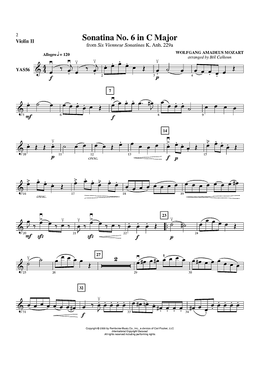 Digital Sheet Music for Sonatina No.6 In C Major - Violin 2 by Wolfgang Amadeus Mozart, Bill Calhoun scored for Orchestra; id:406875