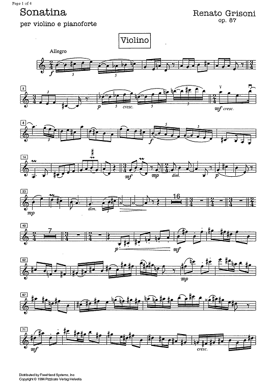 Digital Sheet Music for Sonatina Op.87 - Violin by Renato Grisoni scored for Violin/Piano; id:348077