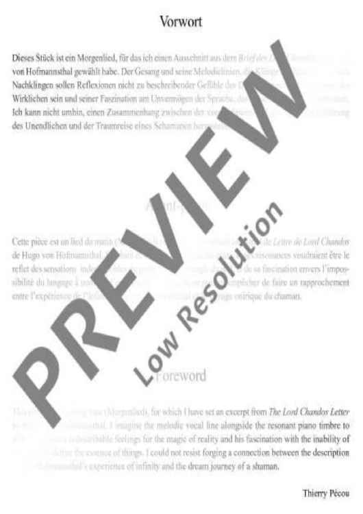 This piece is a morning tune [Morgenlied], for which I have set an excerpt from The Lord Chandos Letter by Hugo von Hofmannsthal. I imagine the melodic vocal line alongside the resonant piano timbre to reflect the poet’s indescribable feelings for the magic of reality and his fascination with the inability of language to define the essence of things. I could not resist forging a connection between the description of von Hofmannsthal’s experience of infinity and the dream journey of a shaman. Thierry Pécou
