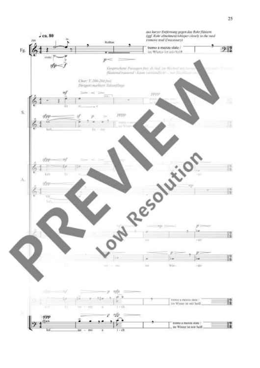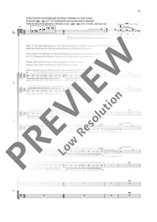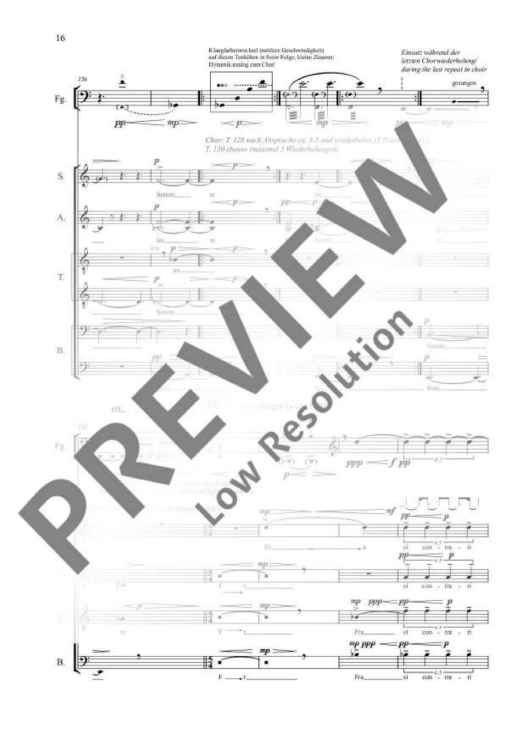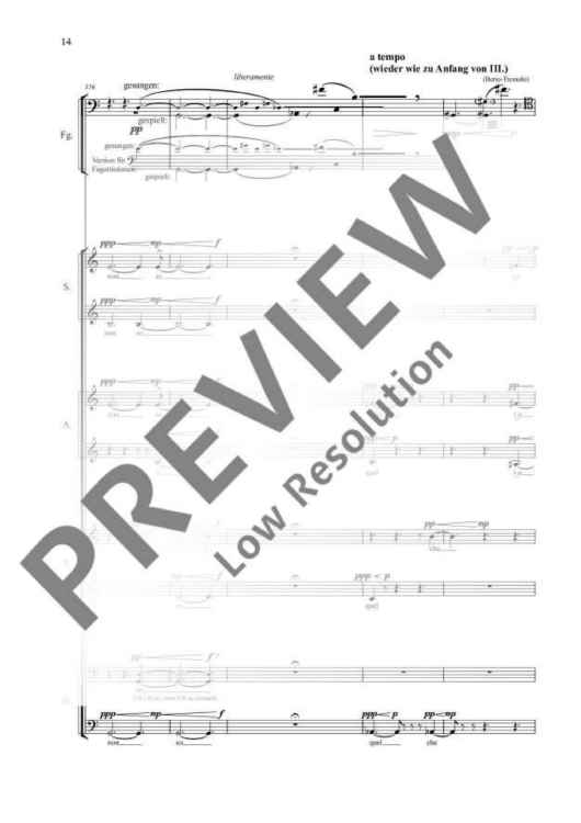 The text of this ‘small sound piece’ combines material from Petrarch’s well-known Sonnet No. 132 and its Baroque adaptation by Martin Opitz, alternating between – and sometimes mixing – Italian and German. The choir and solo bassoon oscillate between fore and background, creating an ‘echo space’ in which sounds are repeated and developed. The horizontal structure of the bassoon part thereby develops a harmonic vertical plane and, conversely, linear structures detach themselves from the harmony of the choral texture and enter the bassoon part. Benjamin Schweitzer