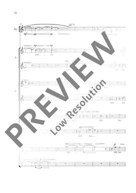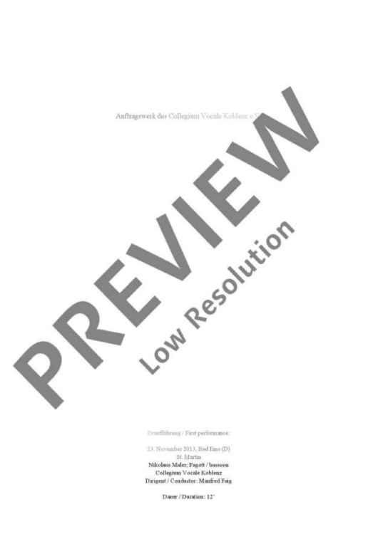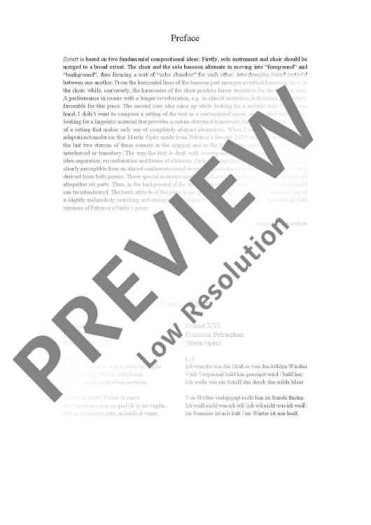 The text of this ‘small sound piece’ combines material from Petrarch’s well-known Sonnet No. 132 and its Baroque adaptation by Martin Opitz, alternating between – and sometimes mixing – Italian and German. The choir and solo bassoon oscillate between fore and background, creating an ‘echo space’ in which sounds are repeated and developed. The horizontal structure of the bassoon part thereby develops a harmonic vertical plane and, conversely, linear structures detach themselves from the harmony of the choral texture and enter the bassoon part. Benjamin Schweitzer