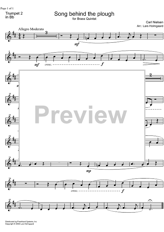 Digital Sheet Music for Song behind the plough - B-flat Trumpet 2 by Lars Holmgaard, Carl Nielsen scored for Brass Quintet; id:332883