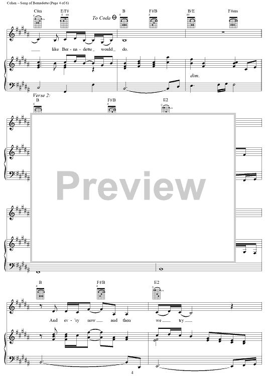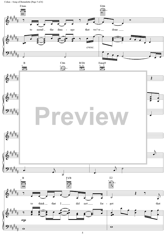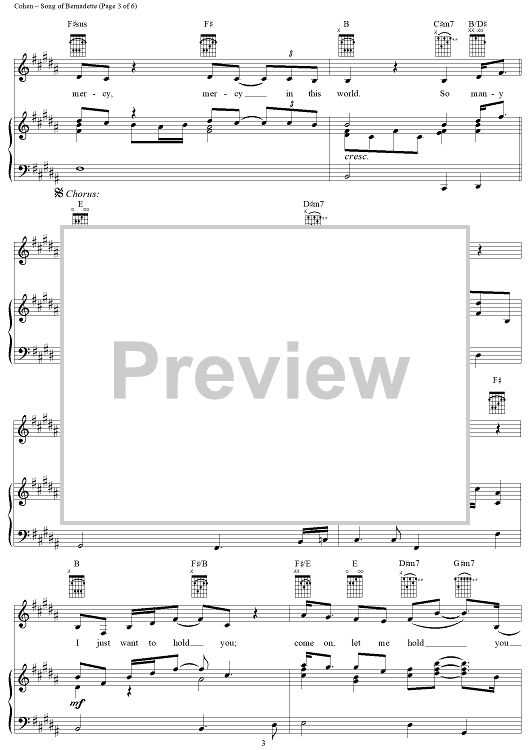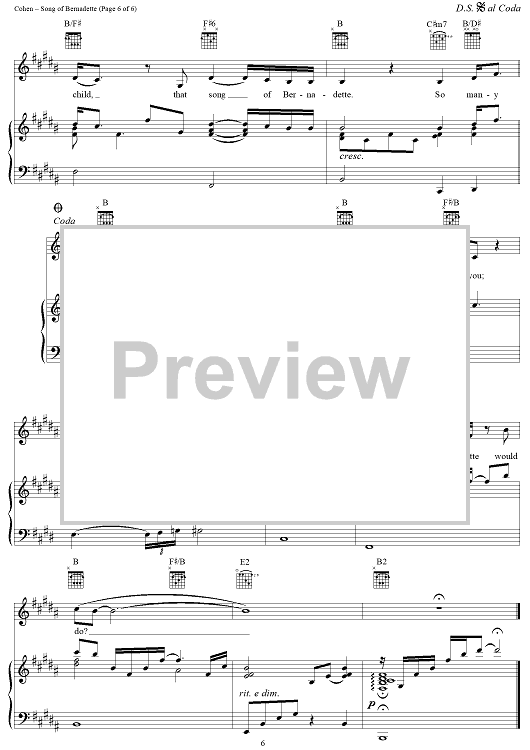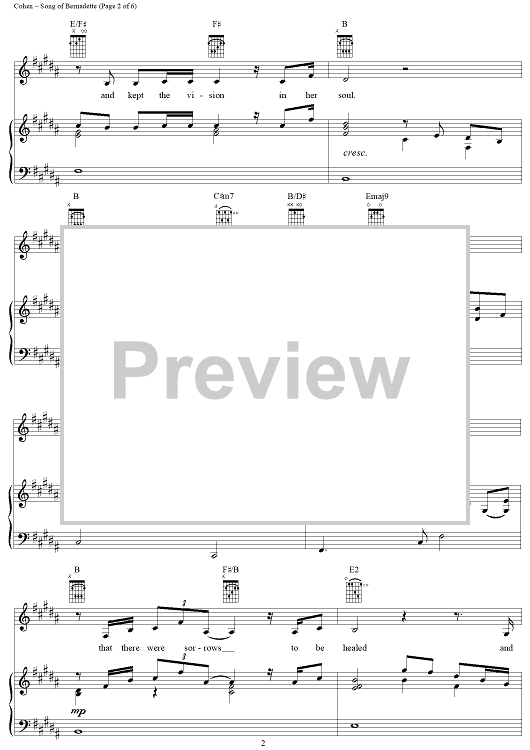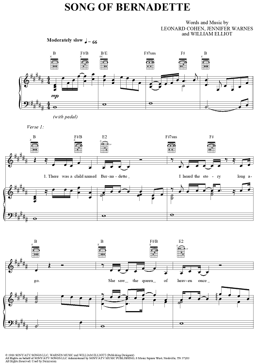 Digital Sheet Music for Song of Bernadette by Jennifer Warnes, William Elliot, Bette Midler, Leonard Cohen scored for Piano/Vocal/Chords; id:272313