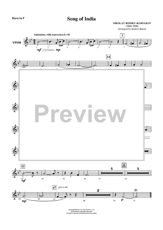 Digital Sheet Music for Song of India - Horn in F by Andrew Balent, Nikolai Rimsky-Korsakov scored for Concert Band; id:420822