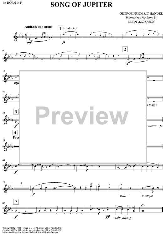 Digital Sheet Music for Song of Jupiter - Horn 1 by George Frideric Handel, Leroy Anderson scored for Concert Band; id:267484