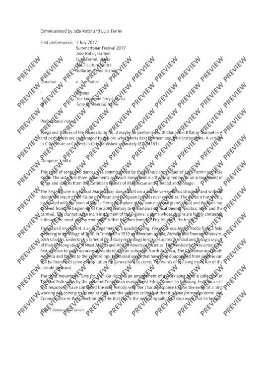This suite of songs and dances was commissioned by the piano/clarinet duet of Luca Ferrini and Jože Kotar. The suite is in three movements and each movement is either inspired by, or an arrangement of songs and dances from the Caribbean islands of Martinique and Trinidad and Tobago. The first, Biguine is a typical Martiniquan dance built on a simple verse chorus structure and without doubt, the result of the fusion of African and European cultures over centuries. The dance is historically associated with the town of Saint - Pierre (birthplace of my own maternal grandfather) and the form has evolved from the beginning of the 20th century to encompass satirical themes, politics, love, and the carnival. The clarinet is the main instrument of the Biguine, a name whose origins are highly contested although the most widespread belief is that it comes from the English verb, “to begin”. The second movement is an arrangement of a quadrille song, You know one Joseph Keeba from a field recording in the village of Toco, in Trinidad. In 1939 an American couple, Melville and Frances Herskovits, both scholars, undertook a series of field study recordings in villages across Trinidad and Tobago as part of their life-long study of West African and African American societies. The Herskovits’ were among the first scholars to paint accurate accounts of African culture in North America, The Caribbean and South America and thanks to their recordings, traditional songs that have long disappeared from practise can still be found and serve as inspiration for generations to come. The words of the song make fun of the cuckold husband. The third movement, Time for Man Go Home is an arrangement of a work song from a collection of Trinidad Folk songs by the eminent Trinidadian musicologist Edric Connor. In this song, built on a call and response, I have combined the solo melody with the chorus response to give the sense of a long working day coming to its end at dusk and the workers calling out t