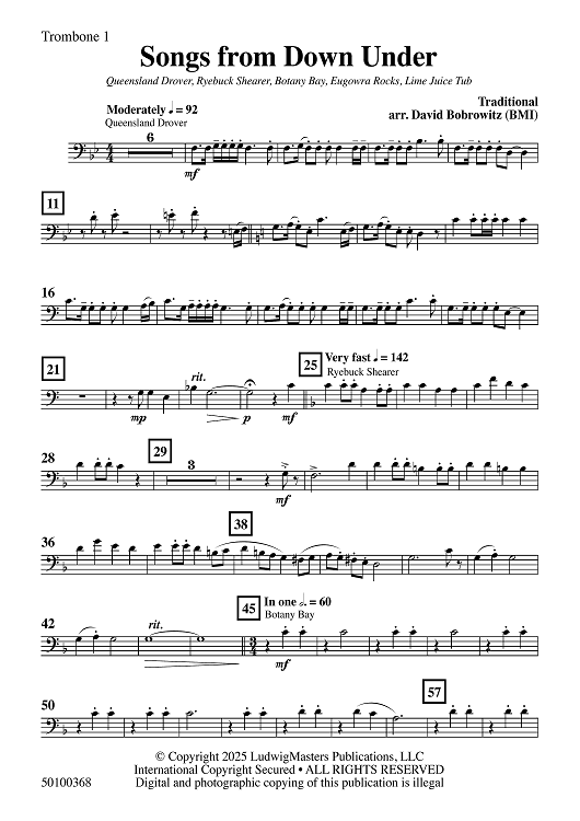 Digital Sheet Music for Songs from Down Under - Trombone 1 by Traditional, David Bobrowitz scored for Concert Band; id:509386