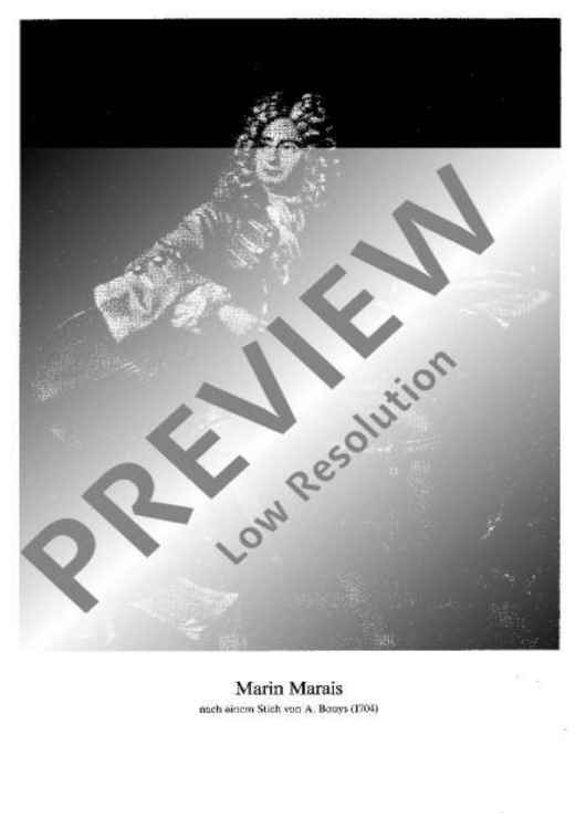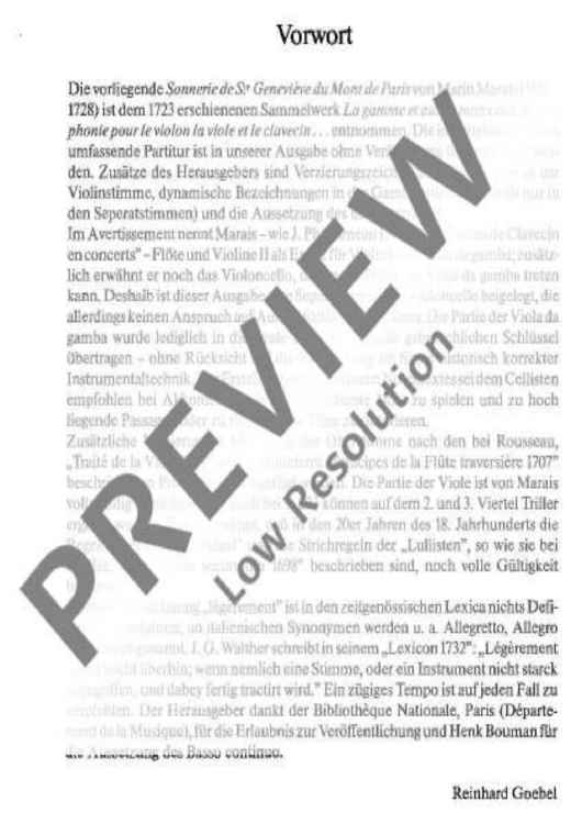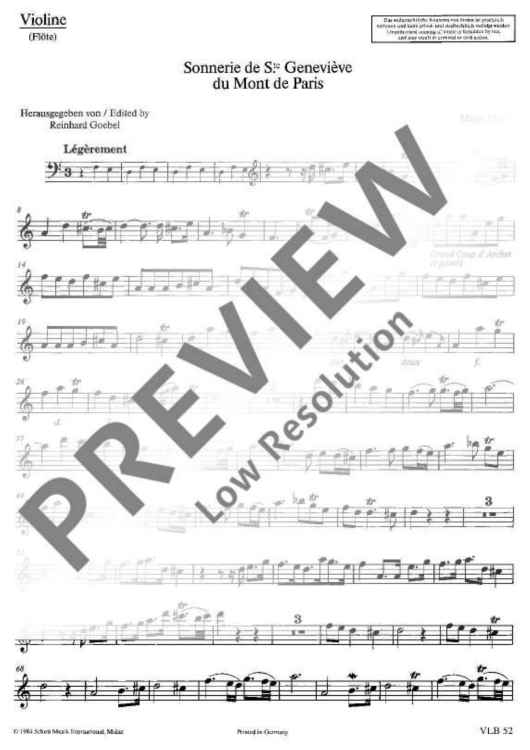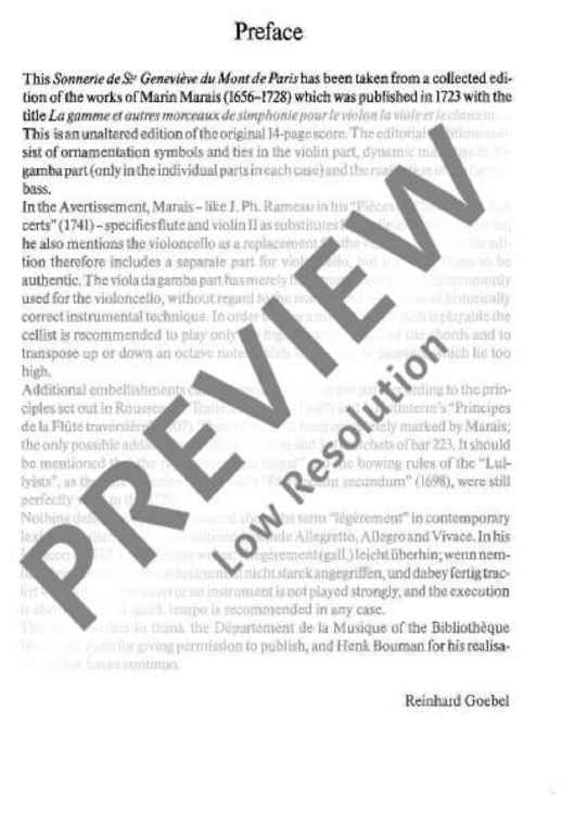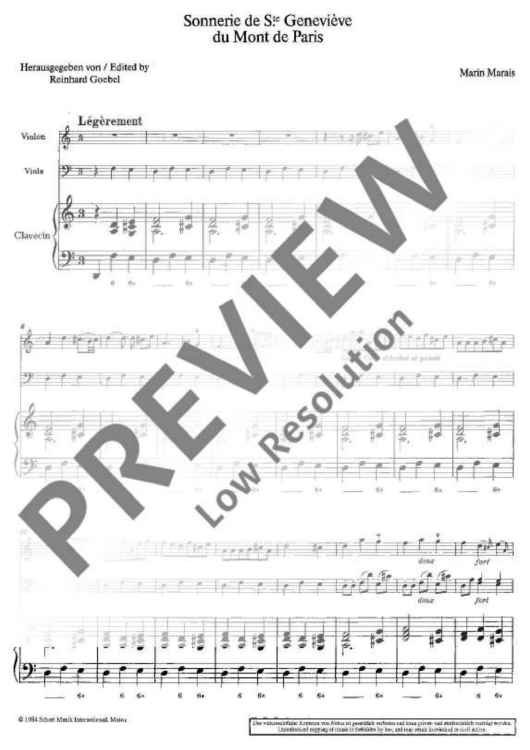 The Sonnerie de St. Geneviève du Mont de Paris was taken from the collected work La gamme et autres morceaux de simphonie pour le viole et le clavecin . The original score of 14 pages has been included in this edition without alterations. The editor has added ornamentation and slurs in the violin part, as well as dynamic markings in the viola da gamba part and the realization of the figured bass. Flute and violin II can be used instead of the violin and viola da gamba. Marin Marais also mentions a violoncello, which can take the place of the viola da gamba. A separate part for violoncello is therefore included with this edition.