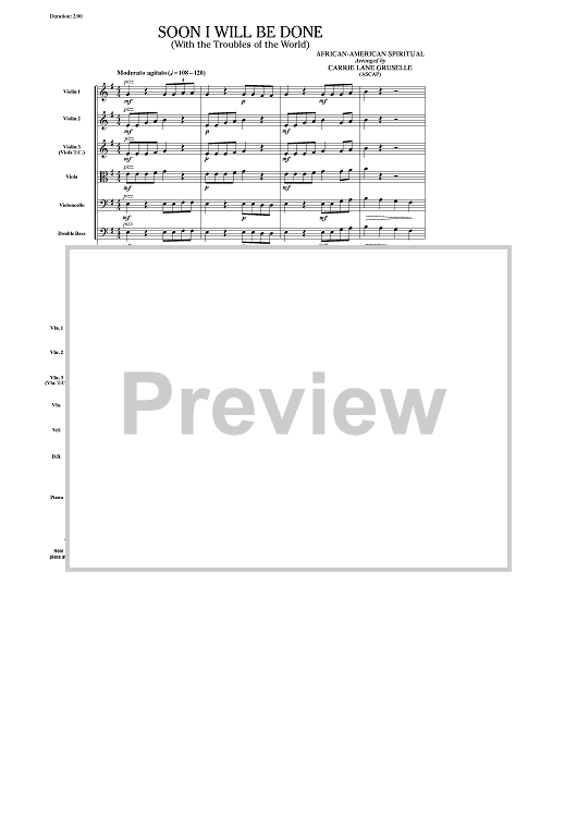 Digital Sheet Music for Soon I Will Be Done - Score by African American Spiritual, Carrie Lane Gruselle scored for Orchestra; id:411541