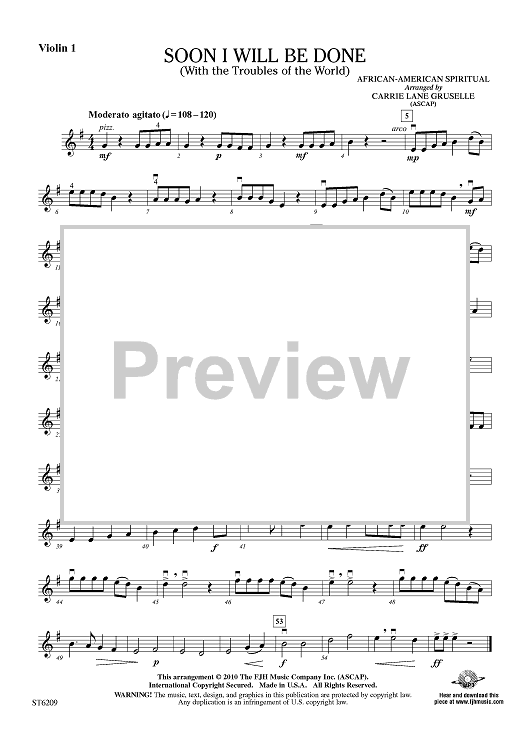 Digital Sheet Music for Soon I Will Be Done - Violin 1 by African American Spiritual, Carrie Lane Gruselle scored for Orchestra; id:411542