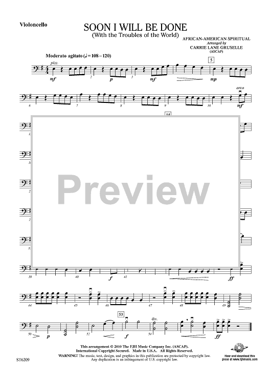 Digital Sheet Music for Soon I Will Be Done - Violoncello by African American Spiritual, Carrie Lane Gruselle scored for Orchestra; id:411546