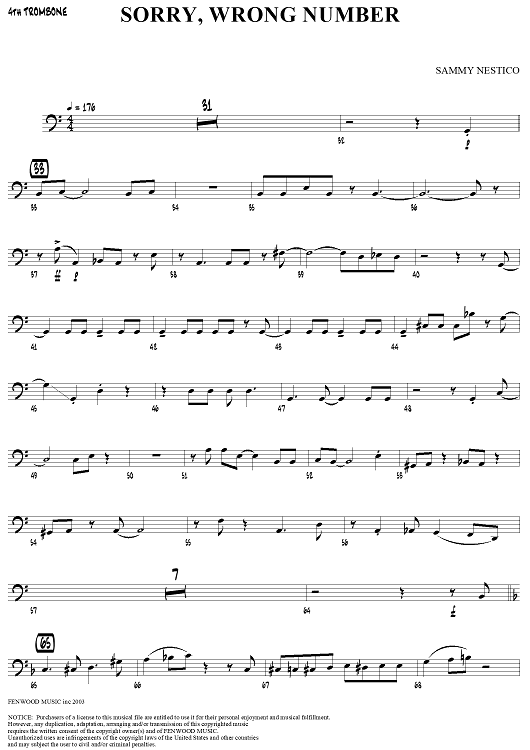 "Sorry, Wrong Number - Trombone 4" Sheet Music by Sammy Nestico
