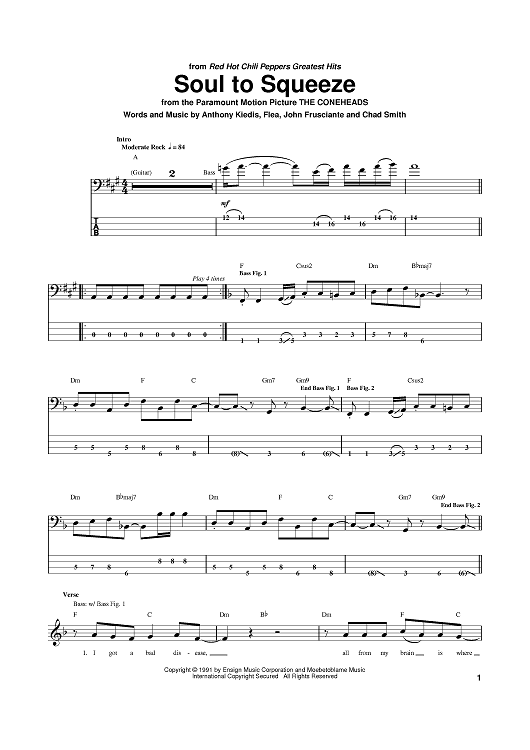 Digital Sheet Music for Soul To Squeeze by Flea, John Frusciante, Anthony Kiedis, Red Hot Chili Peppers scored for Bass Tab; id:374153