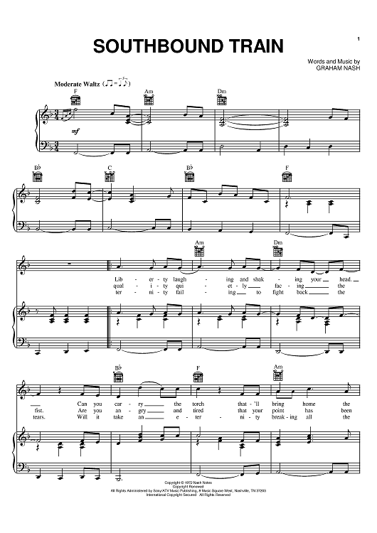 Digital Sheet Music for Southbound Train by Graham Nash, Crosby, Stills, Nash & Young scored for Piano/Vocal/Chords; id:382109